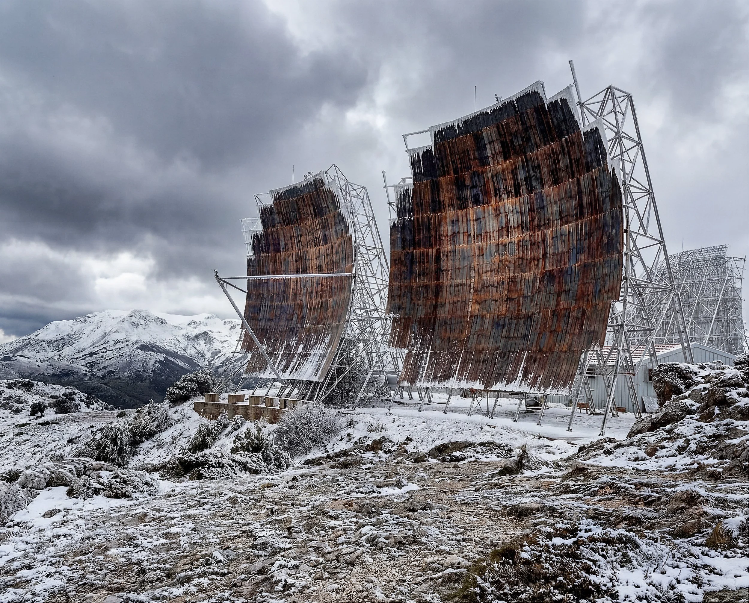 The project is organised into three typologies. The Listeners includes concrete acoustic mirrors that once strained to catch the sound of approaching aircraft, and seismic vaults buried in desert plains, waiting for tremors that would signal a missile launch. The Watchers documents solitary observation towers staring across empty steppes and coastlines, structures built to see without being seen. The Signalers traces the skeletal geometry of early radar lattices and troposcatter screens, the desperate architecture of long-distance communication before the age of satellites.